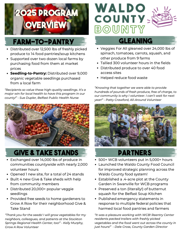 Our Mission: Waldo County Bounty works to ensure that everyone has access to fresh, nutritious food by collaborating with local farmers, organizations, and community members towards an equitable food system.