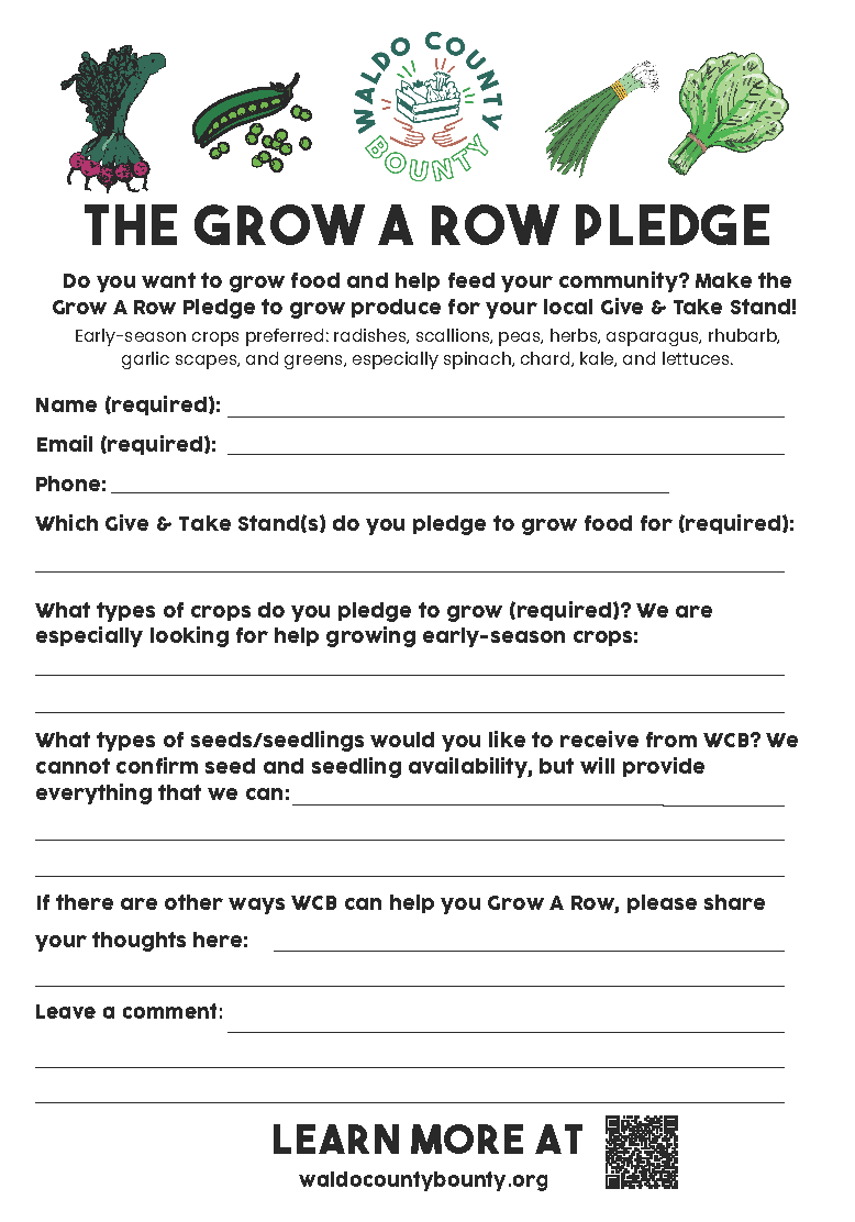 The Grow A Row Pledge is a commitment to grow extra food for the Give & Take program. WCB will support your growing efforts by providing free seeds, seedlings, and other gardening support. We are especially seeking early-season crops, such as radishes, scallions, peas, herbs, asparagus, rhubarb, garlic scapes, and greens, especially spinach, chard, kale, and lettuces.