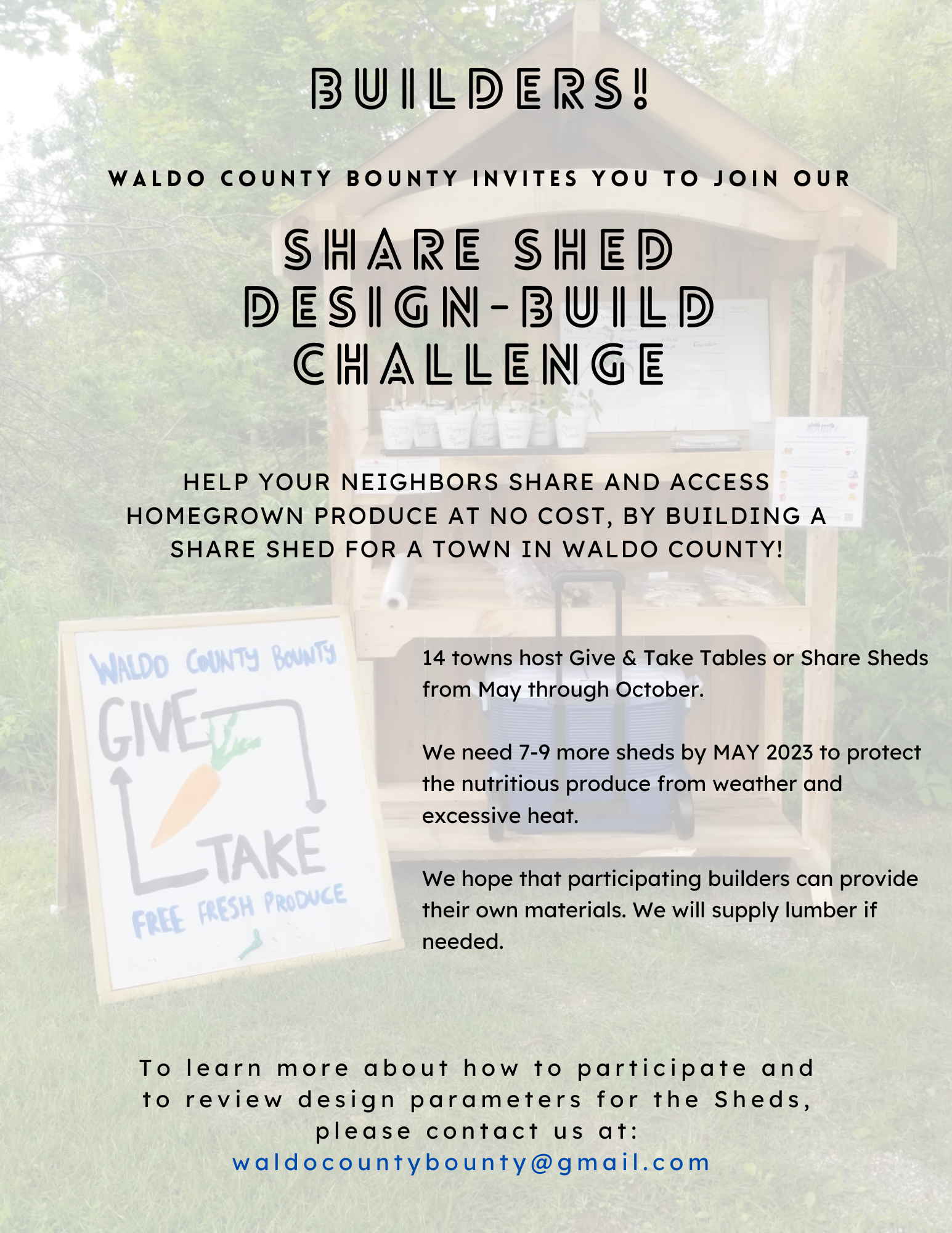 To learn more about participating in our Share Shed design-build challenge, please contact us at: waldocountybounty@gmail.com
